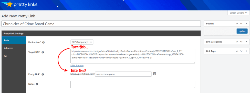 First, type in the name of your affiliate product. Then, enter the long affiliate link provided by your program in the Target URL box. Finally, type in a much shorter slug in the PrettyLinks box