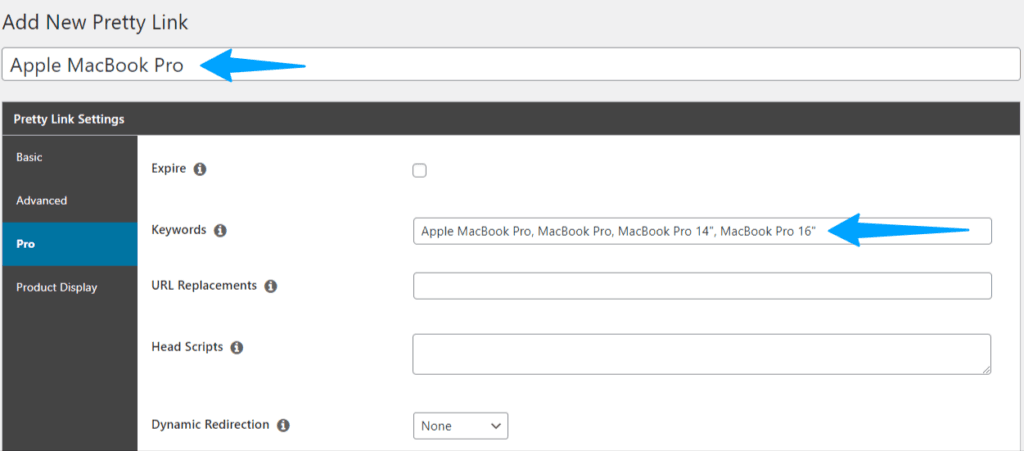 To set up your automatic keyword replacement, all you have to do is create a new pretty link (or chose an existing link), then type in the keywords or phrases you want to monetize in the Pro tab > Keywords box