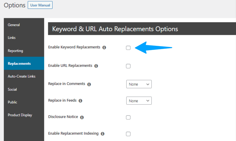 To further customize your automatic keyword replacement, go to Pretty links > Options > Replacements. Select Enable Replacements to expand the page and show additional keyword replacement settings: