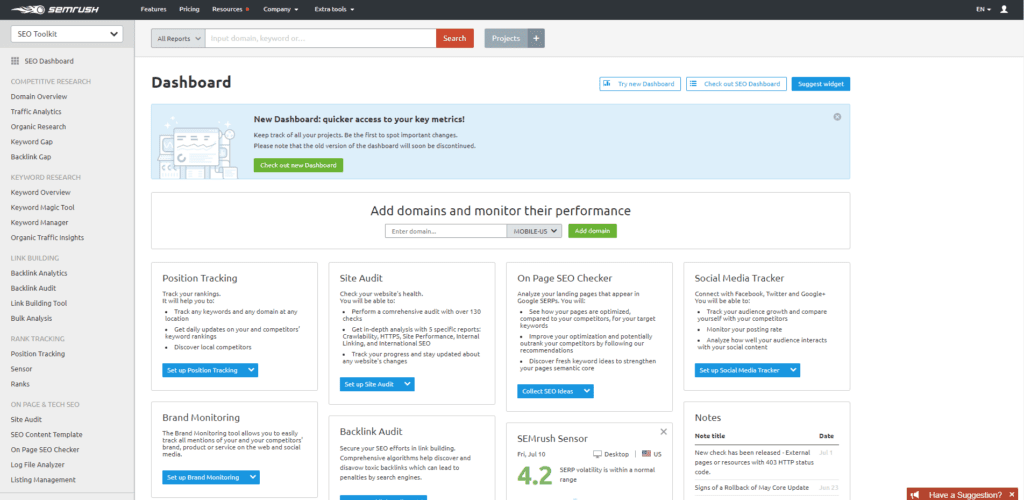 Die kostenlose Version von SEMrush kann Ihnen einen guten Einblick in Ihre Inhaltsstrategie geben. Das Toolkit deckt alles ab, von Keyword-Vorschlägen über Content-Vorschläge bis hin zu organischen Recherchen.