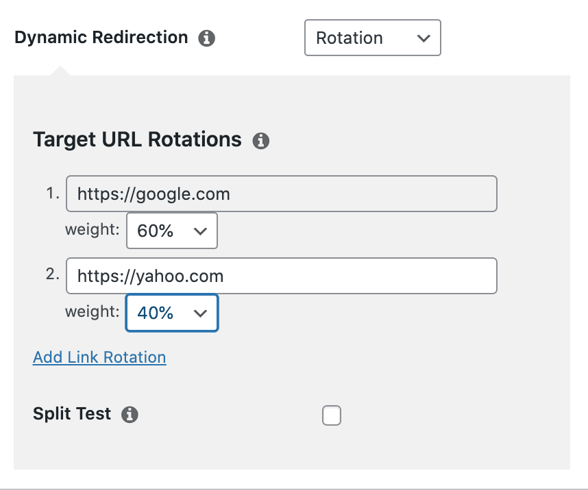Rotations are a great way to send users to different places using one PrettyLinks. PrettyLinks allows you to define up to 20 Target URL’s per PrettyLinks. When the PrettyLinks is clicked, the user will be taken randomly to one of the target URL’s. You can also define a weight to each Target URL. Weights let you define roughly what percentage of the time the user should be taken to that Target URL when clicking on the PrettyLinks. You’ll want to be sure that your weights add up to exactly 100%. There is an example image below: