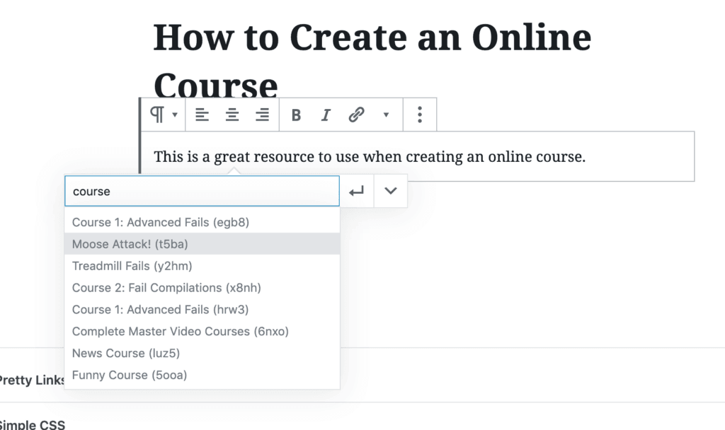 - Intégration du lien de bloc Gutenberg - Vous pouvez maintenant utiliser votre PrettyLinks directement à l'intérieur du bloc de paragraphe Gutenberg. Tout ce que vous avez à faire est de sélectionner le bouton "Pretty Link" dans la barre de formatage de votre bloc de paragraphe, puis vous pouvez rechercher et insérer PrettyLinks instantanément !