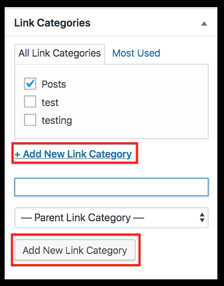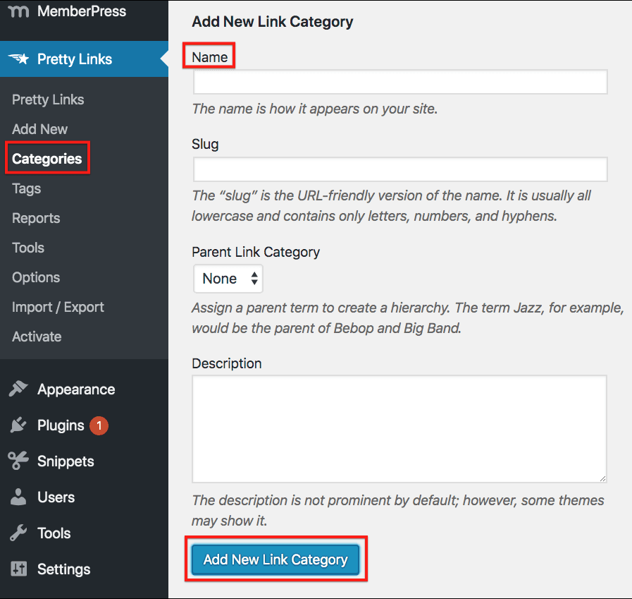 Há duas maneiras de adicionar uma categoria. A primeira maneira é acessar a guia PrettyLinks -> Categoria em seu painel do WordPress. Em seguida, você precisará preencher o formulário, nomeando a categoria e preenchendo qualquer outra informação que desejar. Se o slug for deixado em branco, ele será criado automaticamente da mesma forma que o nome. Quando terminar, clique no botão "Add New Link Category" (Adicionar nova categoria de link) para criar a categoria.
