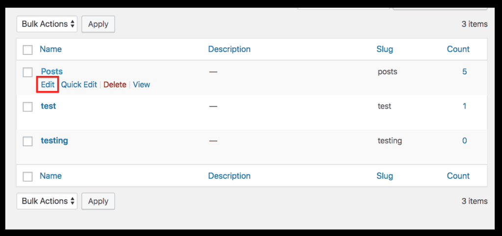 Para editar uma categoria, você precisará ir para a guia PrettyLinks -> Categories (Categorias) no painel do WordPress. Em seguida, passe o mouse sobre a categoria que deseja editar e clique em Edit (Editar).