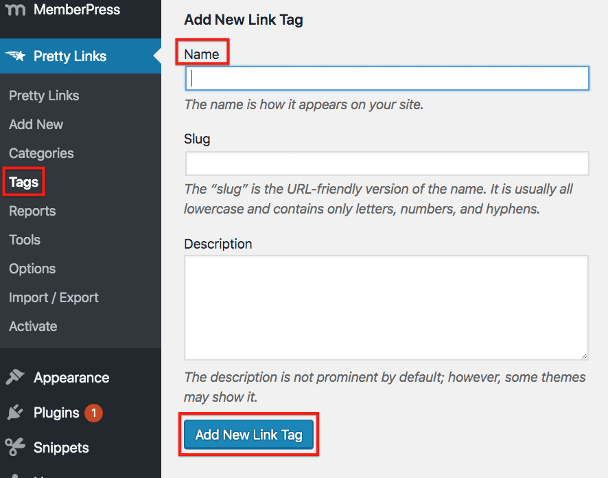 Para adicionar uma nova tag de link, vá para PrettyLinks -> guia Tags em seu painel do WordPress. Em seguida, você precisará preencher o formulário, nomeando a tag e preenchendo qualquer outra informação que desejar. Se o slug for deixado em branco, ele será criado automaticamente da mesma forma que o nome. Quando terminar, clique no botão "Add New Link Tag" para criar a tag.