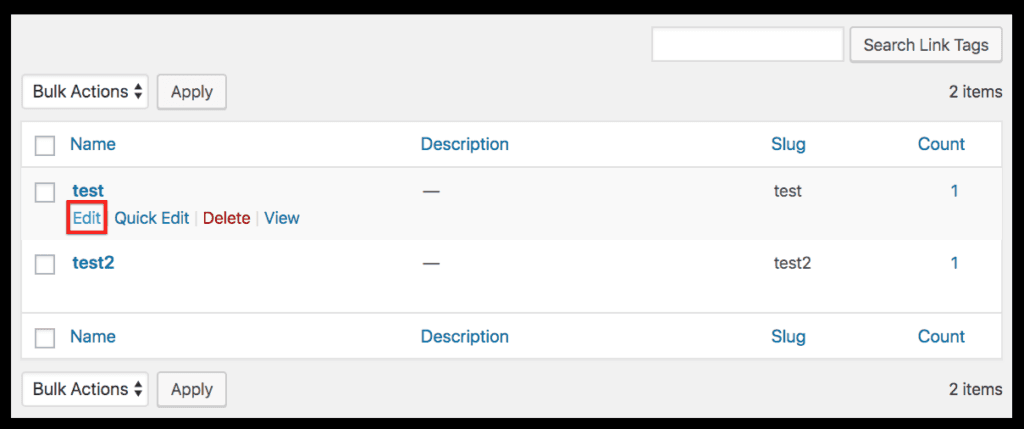 Para editar uma tag, você precisará acessar a guia PrettyLinks -> Tags no painel do WordPress. Em seguida, passe o mouse sobre a tag que deseja editar e clique em Edit (Editar).