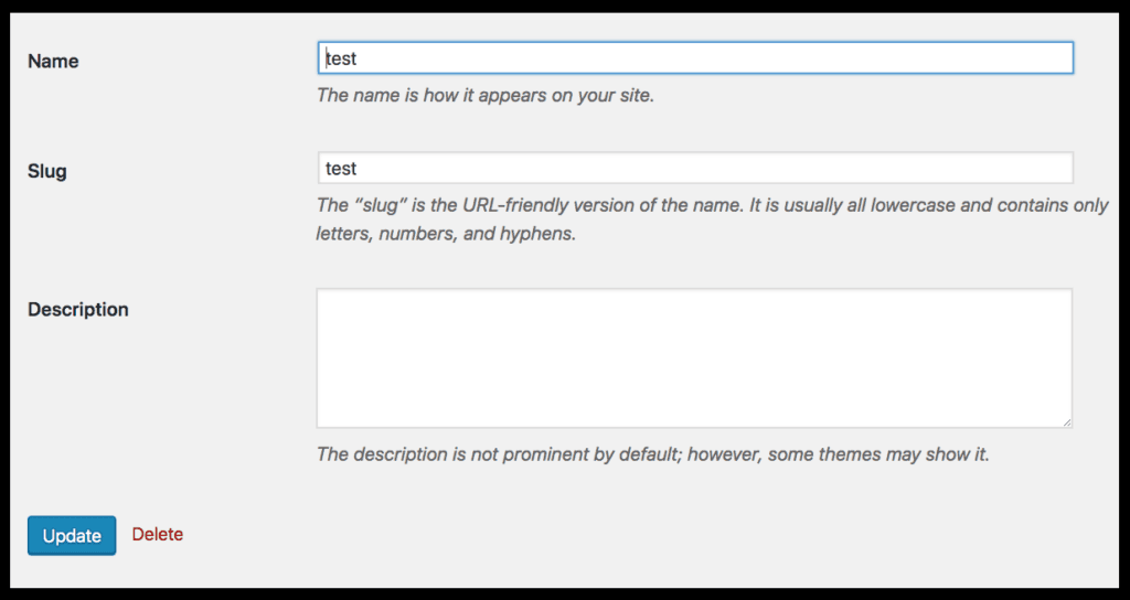Você será levado a uma página em que poderá alterar as informações sobre a tag, incluindo o nome, o slug e a descrição. Clique em atualizar quando terminar de editar para salvar as alterações feitas.