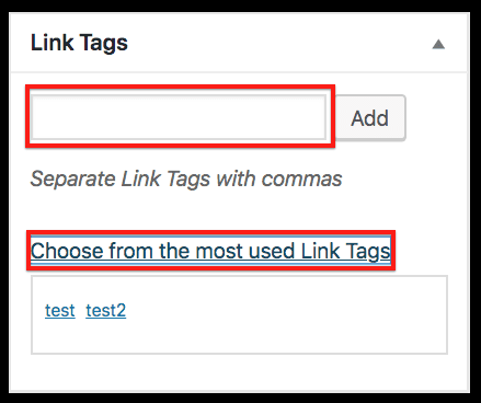 Para atribuir categorias aos seus links, vá para PrettyLinks -> guia PrettyLinks no painel do WordPress. No lado direito, há um contêiner chamado Link Tags. Você pode digitar as tags que gostaria de atribuir ao link (separando-as por vírgula se adicionar mais de uma) e clicar em "Add" (Adicionar) ou clicar no link "Choose from the most used link tags" (Escolha entre as tags de link mais usadas) e selecionar diferentes tags. Clique no botão Update (Atualizar) quando terminar de atribuir as diferentes tags.